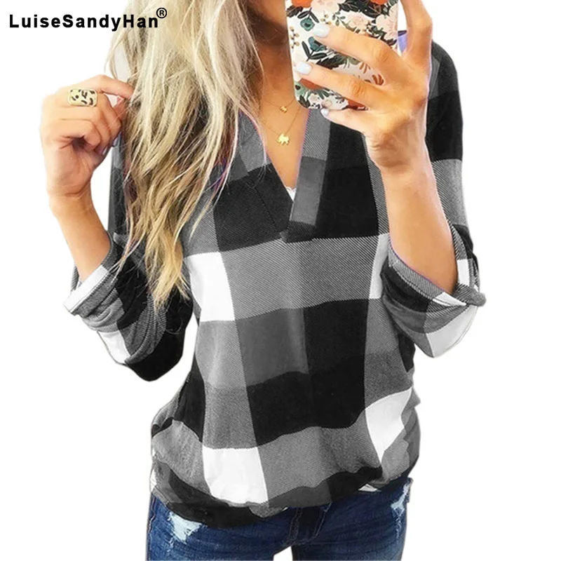 Printed Stitching Shirt Women Long-sleeved Plaid Casual Non-decorative V-neck Sleeve Pullover Blouses Female 2020 Spring Summer