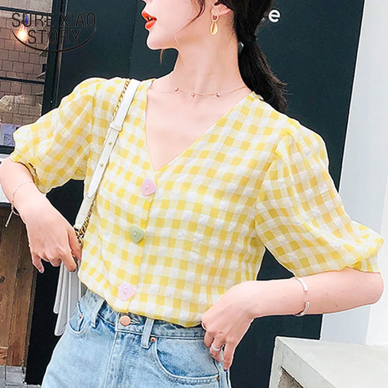 Новая Корейская офисная Повседневная рубашка на пуговицах, зеленая, желтая, милая женская рубашка с коротким рукавом, полосатая клетчатая ш...