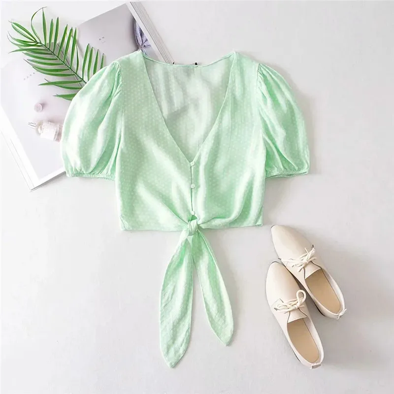 Женская мода, зеленая короткая блузка в горошек, женская летняя Весенняя однобортная рубашка с бантом, Женская Повседневная рубашка с коротким рукавом и v-образным вырезом