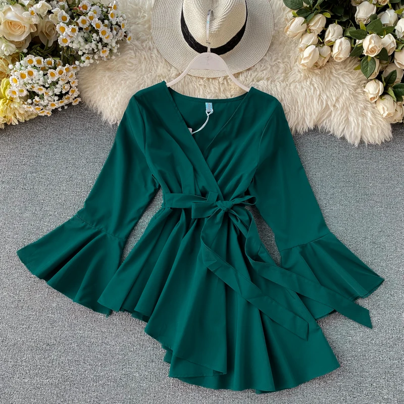 Женская длинная рубашка, дизайн, необычная, на шнуровке, талия, рукав-клеш, v-образный вырез, однотонный, темперамент, топы, офисные, женские р...
