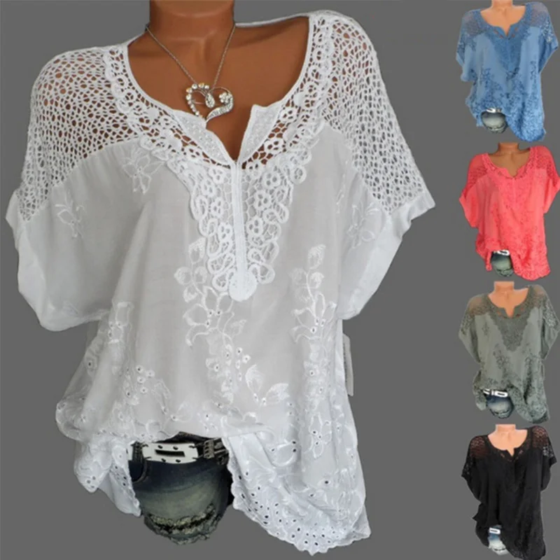 Женская кружевная блузка с коротким рукавом «летучая мышь», белая блузка с v-образным вырезом и вышивкой, 5XL, лето 2019