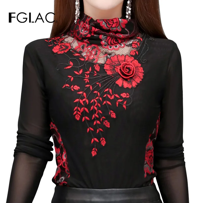 M-7XL blusas mujer de moda 2019, осенняя Водолазка с длинным рукавом, сетчатые топы, элегантная тонкая блузка с вышивкой, рубашка размера плюс, рубашка