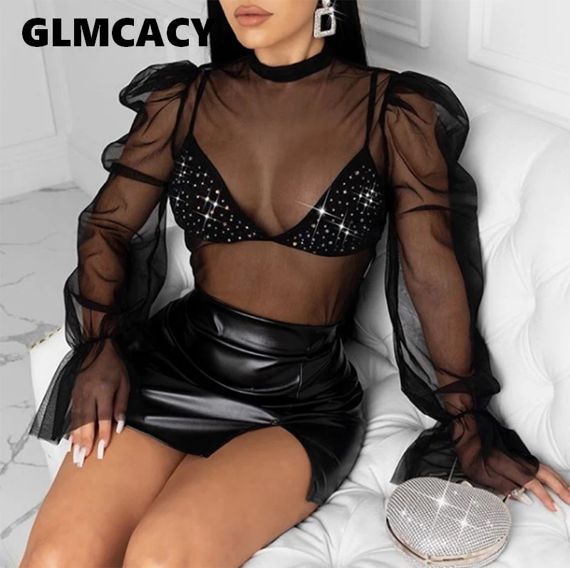 Women Spring Summer Turtleneck Solid See Through Blouse Tops Basic Shirt Top with Embellished Bra