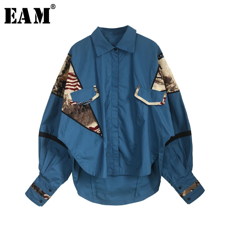 [EAM] женская синяя блуза большого размера с принтом, новая свободная рубашка с отворотом и рукавами-фонариками, модная весенняя Осенняя 2020 JL755
