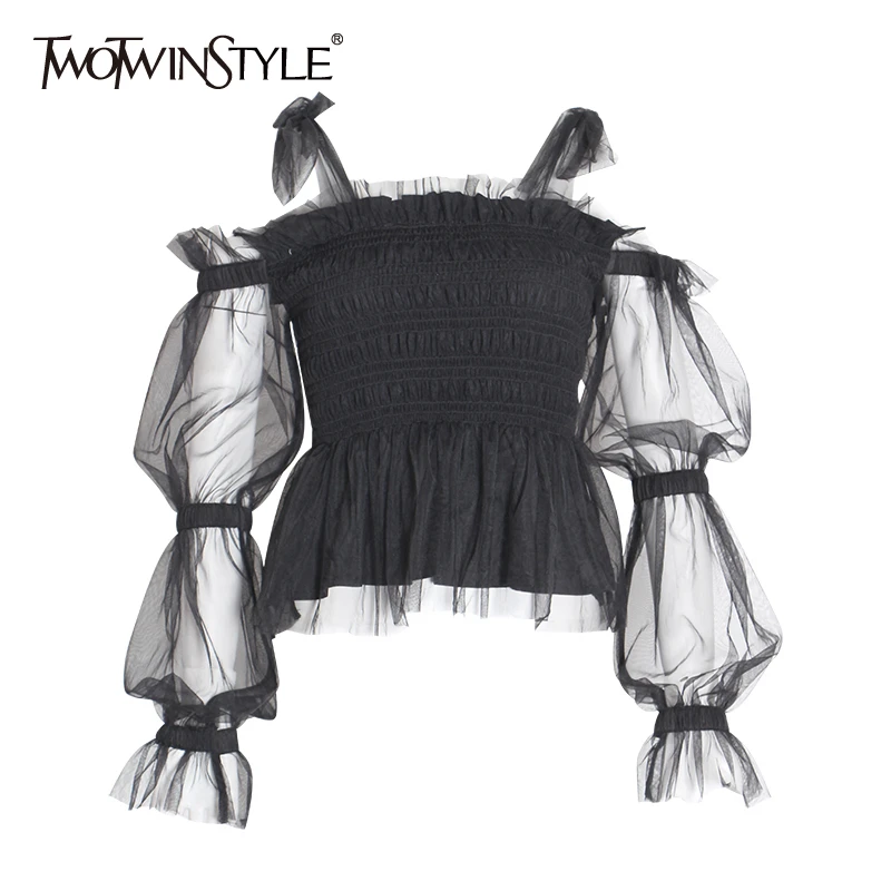 TWOTWINSTYLE Bowknot Patchwork Mesh Perspective Shirt For Women Spaghetti Off Shoulder Puff Sleeve Blouse Female 2020 Spring New