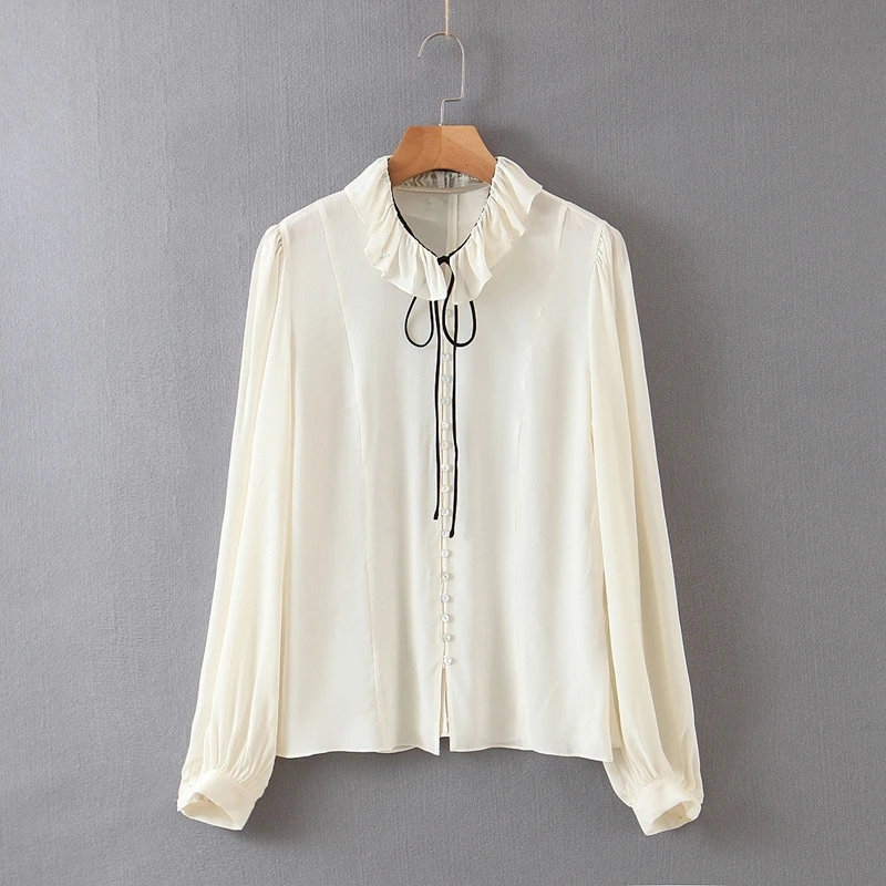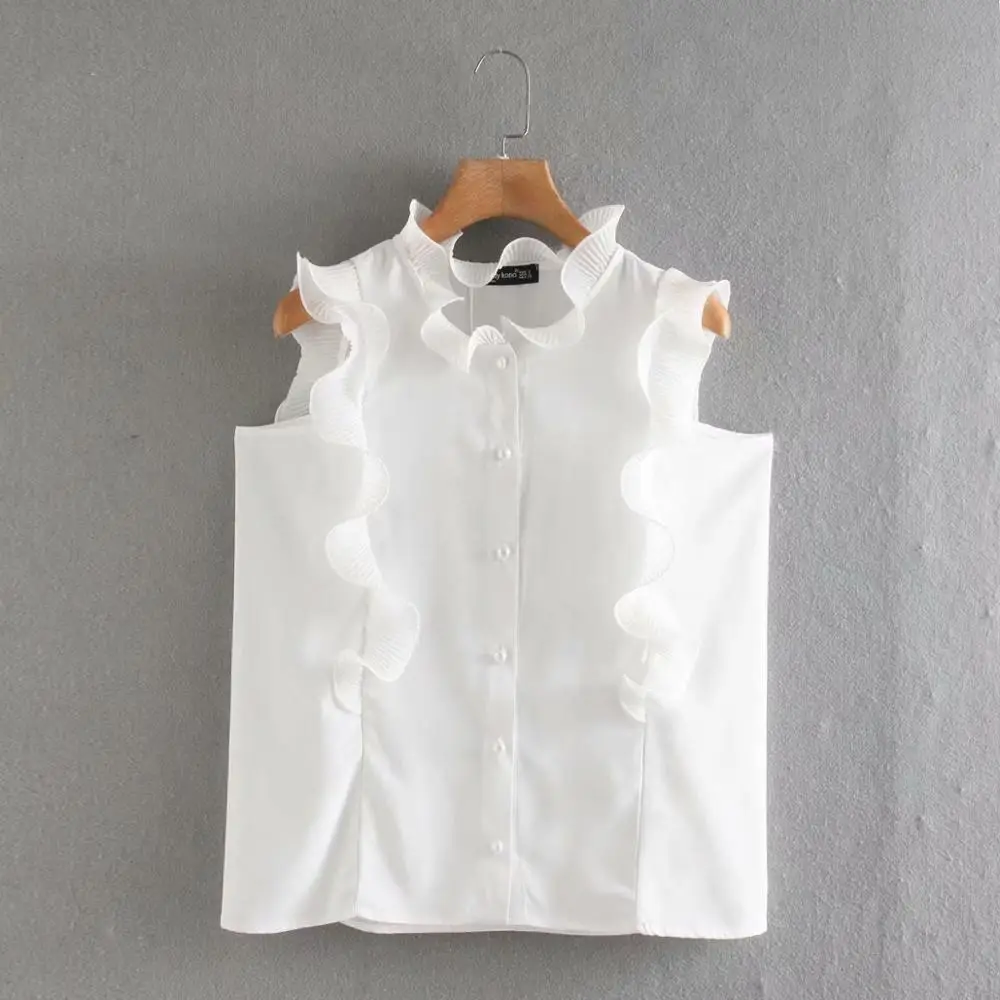 Новинка, женская шифоновая блузка без рукавов, украшенная оборками, с жемчужными пуговицами, белые рубашки для отдыха, шикарная сорочка, топы