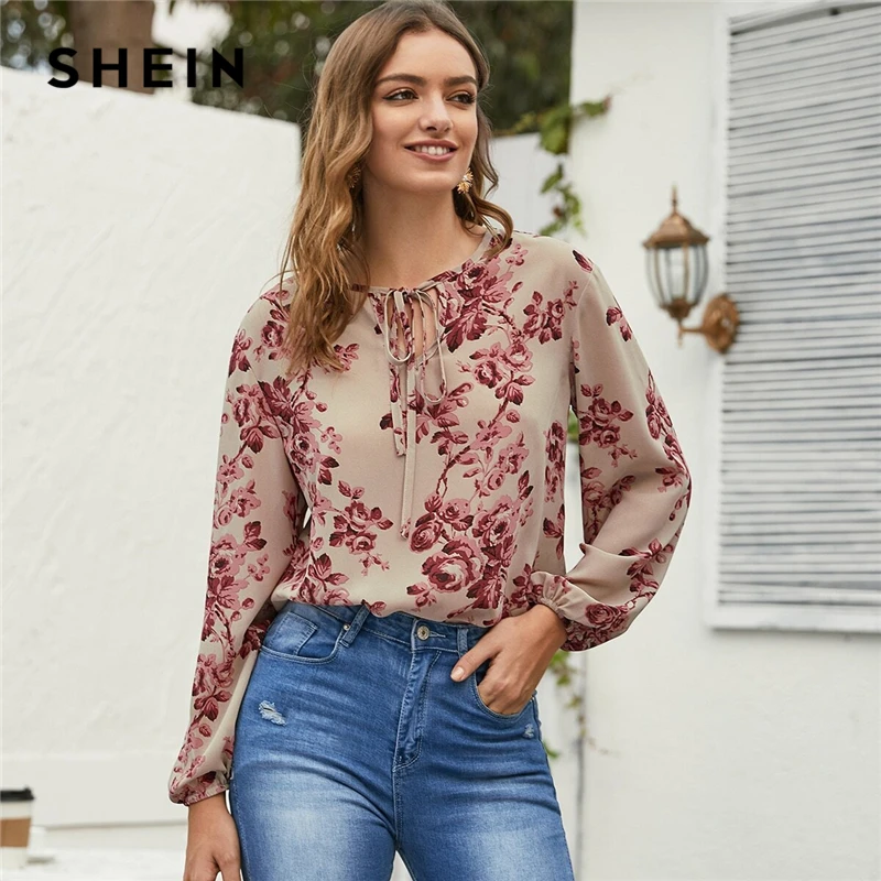 SHEIN Повседневная Блузка с цветочным принтом и завязками на шее, женские топы 2020, Весенняя Праздничная разноцветная Женская богемная блузка с длинным рукавом, рубашки