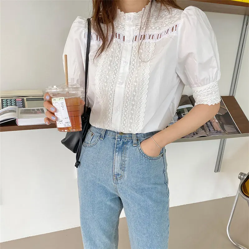 HziriP винтажная вышитая рубашка с коротким рукавом белая стоячая 2020 Горячая Летняя лоскутная Милая универсальная Блузка для девочек