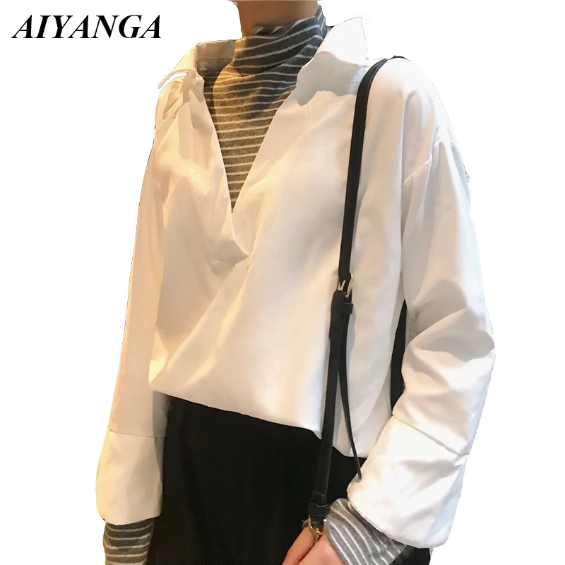 2019 женская рубашка с длинным рукавом и v-образным вырезом, топ, весна и осень, большой размер, свободная рубашка в горошек с длинным рукавом, П...