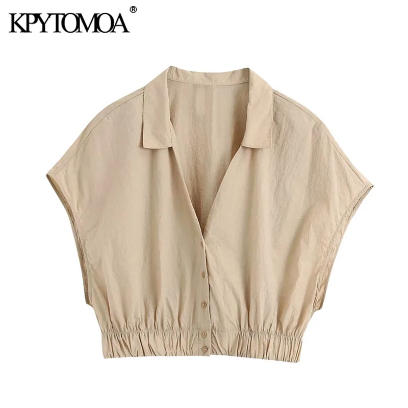 KPYTOMOA Женская мода 2020 Удобные укороченные блузки на пуговицах винтажные женские рубашки без рукавов с эластичным подолом Блузы шикарные топы
