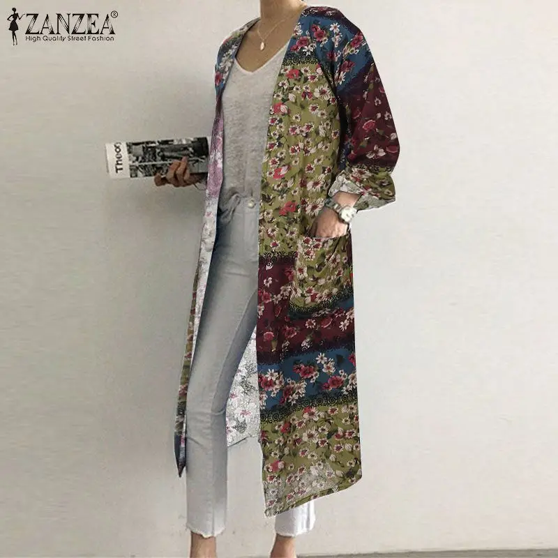 ZANZEA женский кардиган с открытым передом и длинным рукавом, винтажные длинные рубашки с цветочным принтом, осенняя богемная блузка, халат из ...