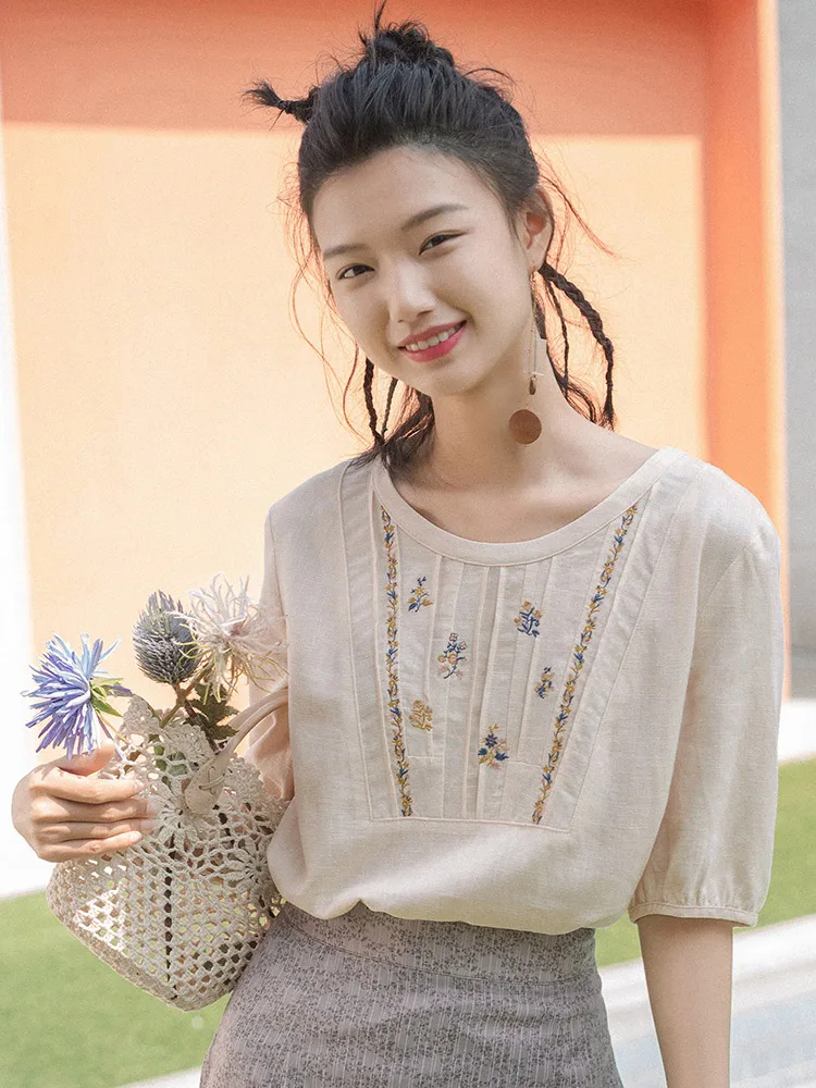 INMAN 2020 Лето Новое поступление льняная хлопковая вискозная Свободная блузка с круглым воротником и вышивкой
