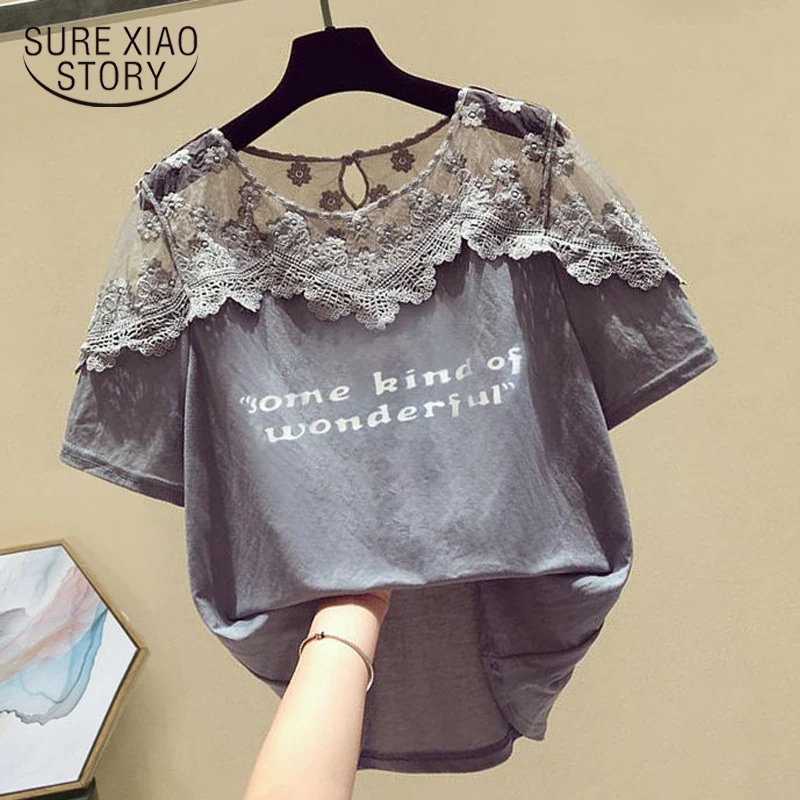 Женская блузка из хлопка с коротким рукавом, женская блузка, женская блузка, Новинка лета 2020, Женская свободная Корейская кружевная рубашка с принтом, рубашка с круглым вырезом, 8861 50