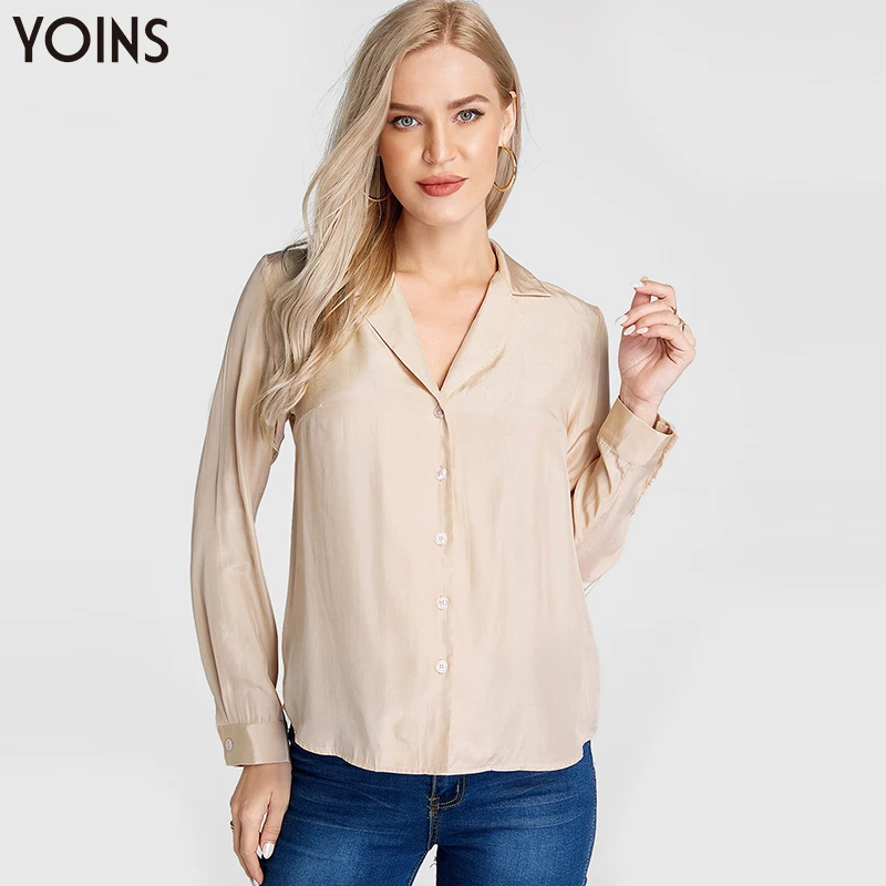 YOINS 2019, женская элегантная блузка с отложным воротником, на пуговицах спереди, с длинным рукавом, Женская Офисная шикарная рубашка, повседне...