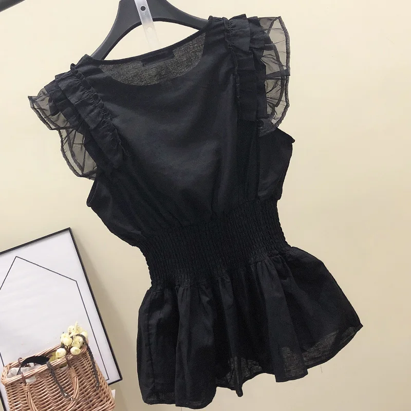 Гофрированная сетчатая Лоскутная Женская блузка без рукавов, черная с круглым вырезом и эластичной талией, облегающие Женские блузки, 2020, летние женские топы, одежда