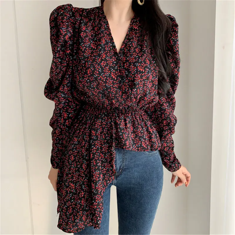 Женские рубашки, одноцветные, в клетку, сексуальные, с глубоким v-образным вырезом, с пышными рукавами, однобортные, на пуговицах, для офиса, д...