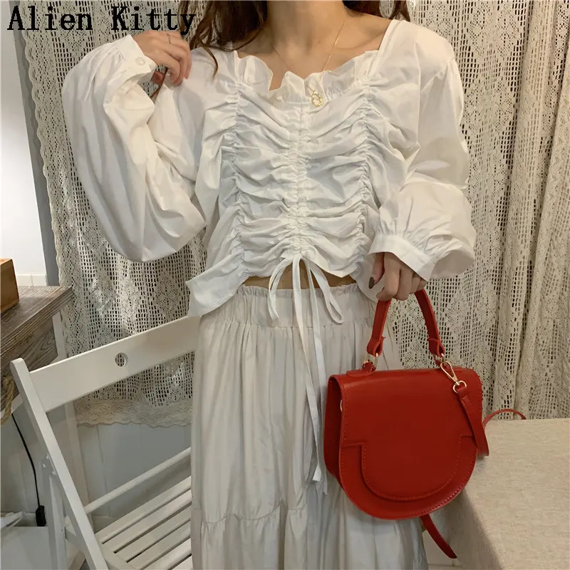 Эластичная плиссированная Однотонная рубашка с принтом «Alien Kitty» на завязках, новинка 2019, летняя простая элегантная женская Повседневная бе...