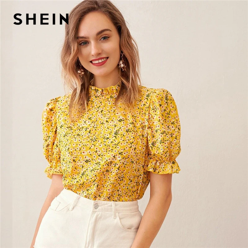 Женская блузка с цветочным принтом SHEIN, блузка с вырезом-крылышком и рукавами-фонариками на спине, элегантные офисные топы и блузки на лето 2020
