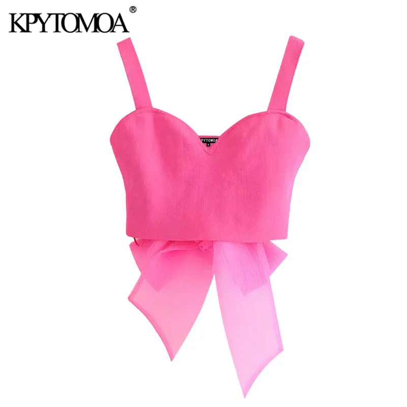 KPYTOMOA женская сексуальная мода 2020 с бантом из органзы, укороченная трикотажная блузка, винтажная открытая спина, v-образный вырез, на бретельках, женские рубашки, шикарные топы