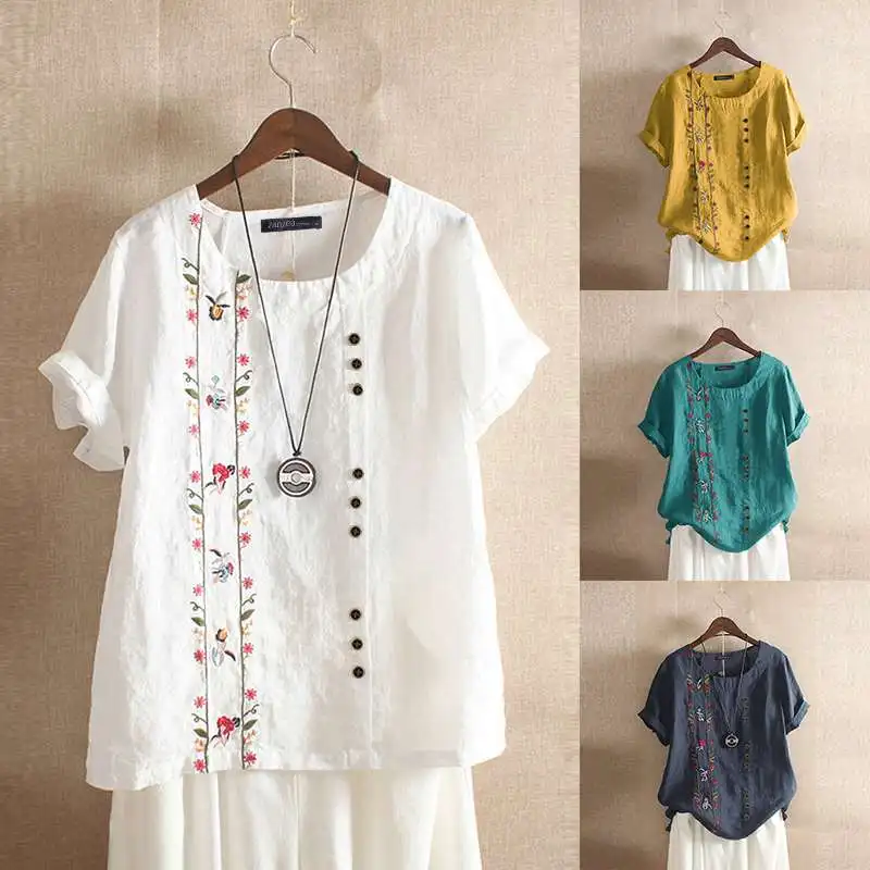 Женская туника с вышивкой, 2019, ZANZEA, элегантная льняная блузка, женская футболка с круглым вырезом, летняя блуза с коротким рукавом размера пл...
