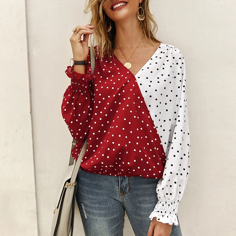 Женская цветная рубашка в горошек с длинными рукавами, летние женские повседневные топы с v-образным вырезом, черные, красные, Желтые Повсед...