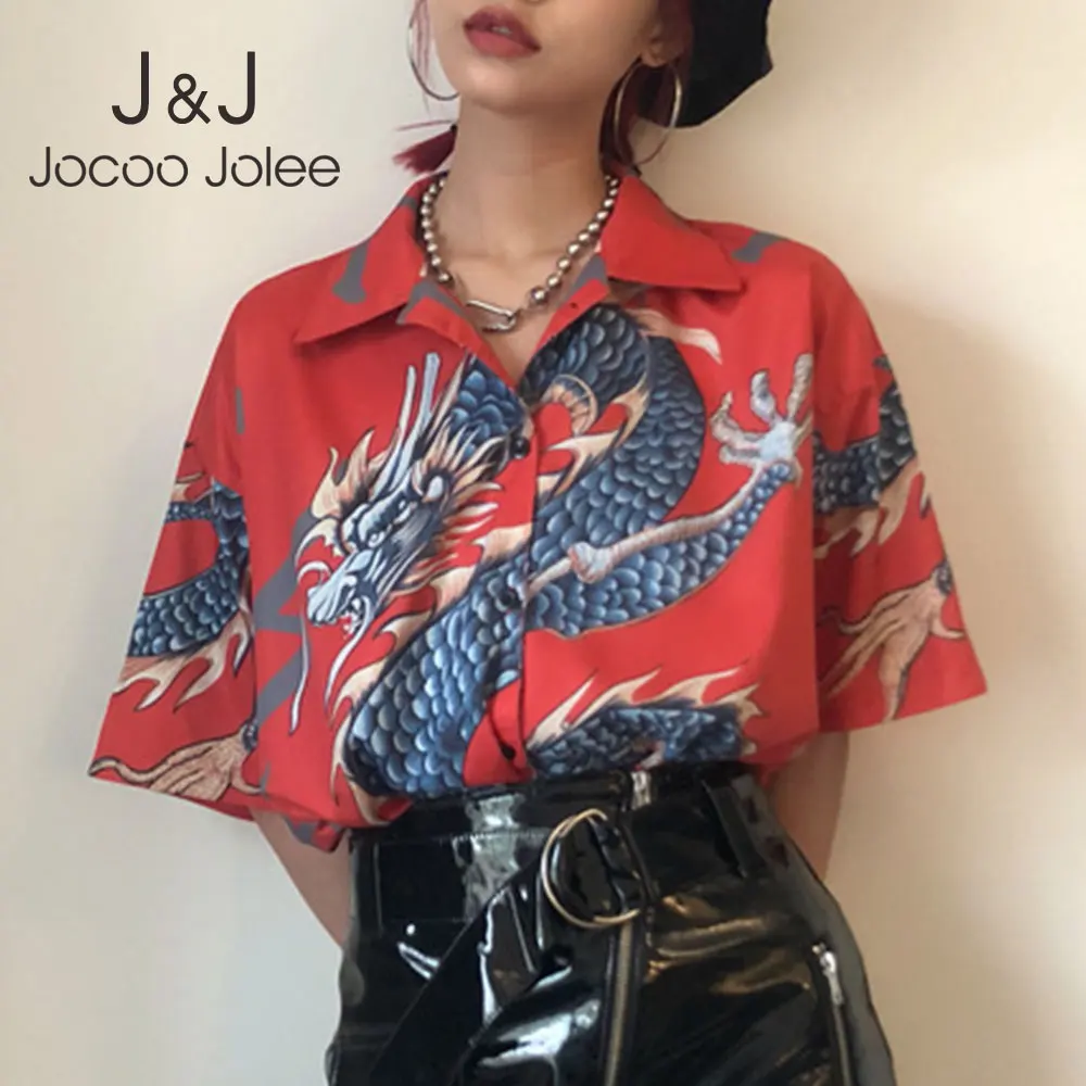 Jocoo Jolee для женщин Свободная блузка хараджуку Лето короткий рукав Дракон печати рубашки для мальчиков корейский BF стиль Топы и блузки Уличная одежда