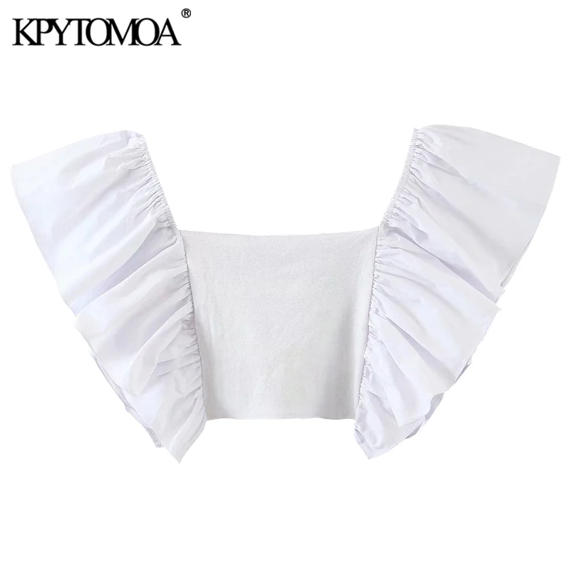 KPYTOMOA Женская мода 2020 Лоскутная ребристая укороченная блузка в винтажном стиле с квадратным воротником и коротким рукавом, плиссированные женские рубашки, шикарные топы