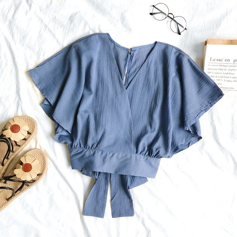 Бренд 2019 Для женщин летние рукав "летучая мышь" v-образным вырезом основной рубашка с бантом элегантные на шнуровке бинты Тонкий Высокая Тал...