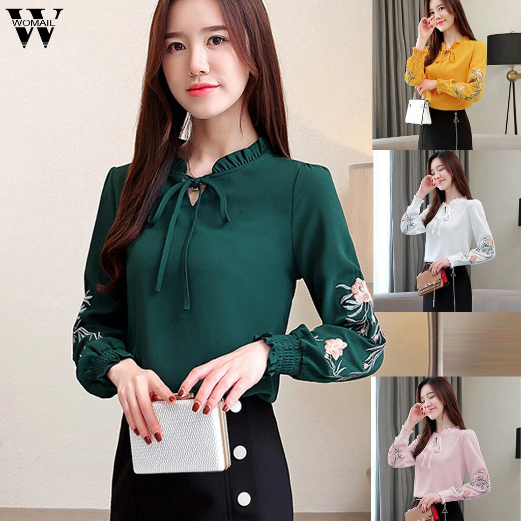Womail блузка женская с вышивкой модная с длинным рукавом Элегантная рубашка с галстуком-бабочкой Корейская Повседневная рабочая одежда офис...