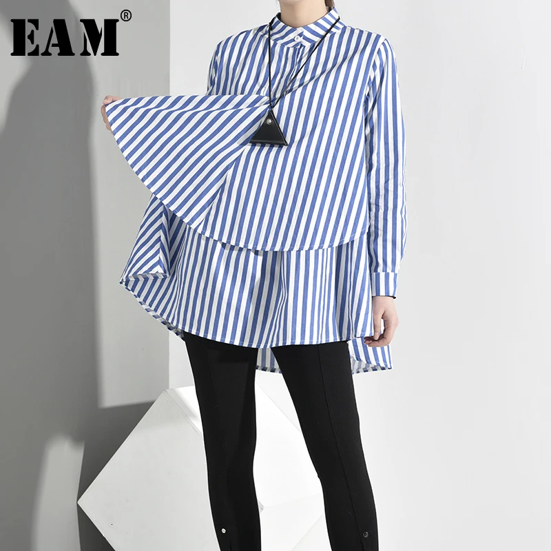 [EAM] женская синяя полосатая блуза большого размера, новая свободная рубашка со стоячим воротником и длинным рукавом, модная весенняя Осення...