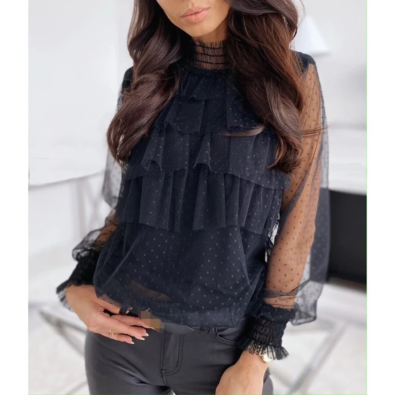 Женская сексуальная прозрачная сетчатая блуза в горошек с оборками и длинным рукавом, Офисная женская элегантная повседневная блуза в Корейском стиле SJ5369E