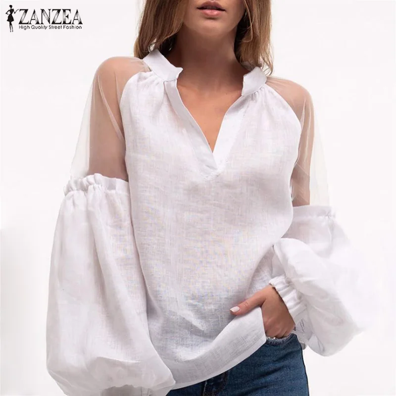 Элегантные женские офисные белые рубашки ZANZEA 2020 модная женская блузка Повседневная Туника Топы Сексуальная Лоскутная Кружевная туника с р...