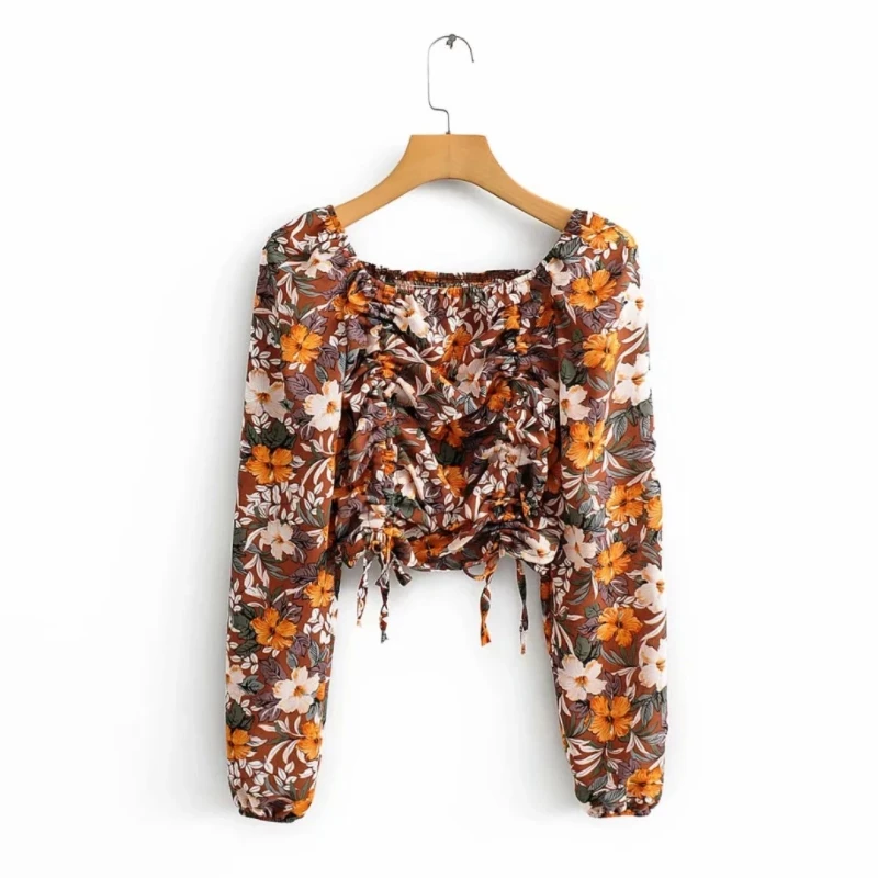 Женская блузка с тропическим цветочным принтом на завязках, эластичная блузка с длинным рукавом, топы LS6455, новинка 2020