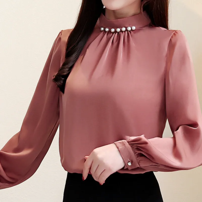 Модные женские топы и блузки с бисером и стоячим воротником, офисная блузка, женские шифоновые блузы, рубашки с длинным рукавом, женские руб...