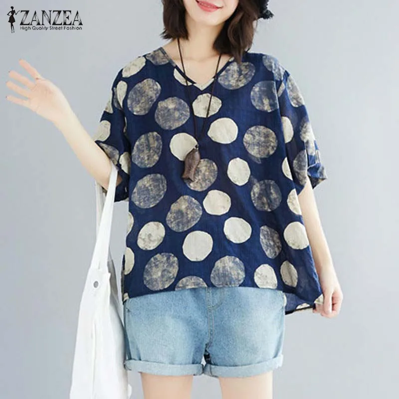 2019 женские рубашки блузки ZANZEA женские с коротким рукавом в горошек Blusas офисные Chemisers Mujer хлопок OL Туника Топы Плюс Размер