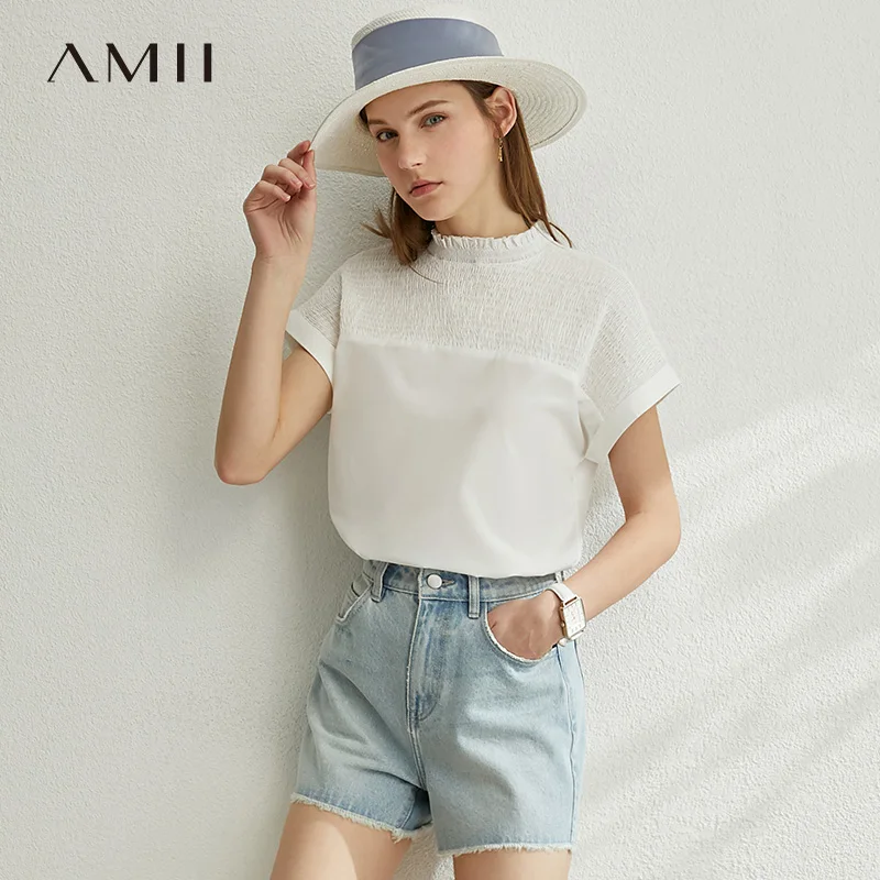 AMII минимализм, весна-лето, женская блузка с рюшами, топы, повседневная, с короткими рукавами, свободная женская блузка, 12040121