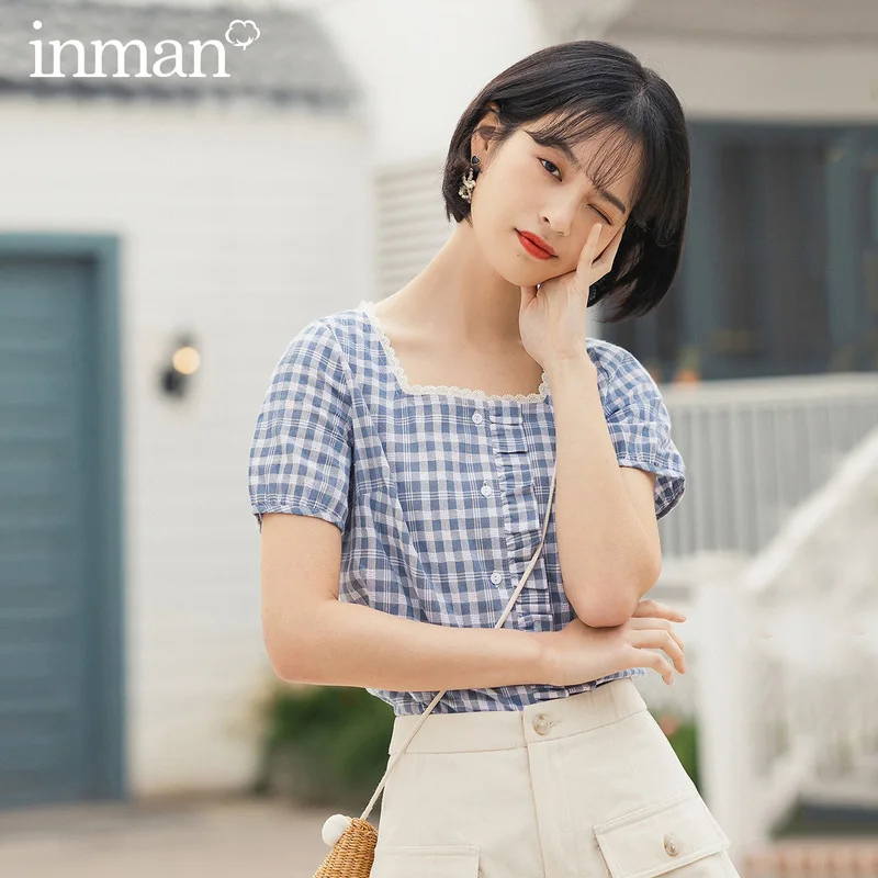 INMAN 2020 г., Новое поступление, летняя Клетчатая блуза с коротким рукавом и кружевным квадратным вырезом