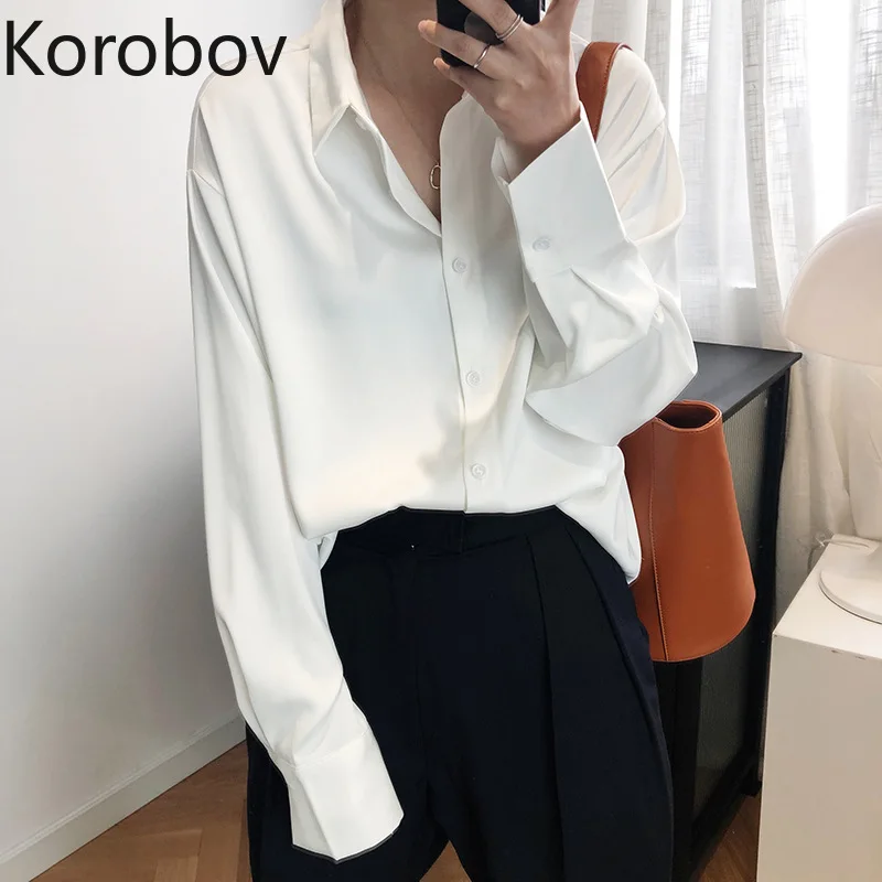 Korobov Новое поступление корейские однотонные женские блузки винтажные элегантные рубашки с длинным рукавом 2020 летние однобортные женские блузы