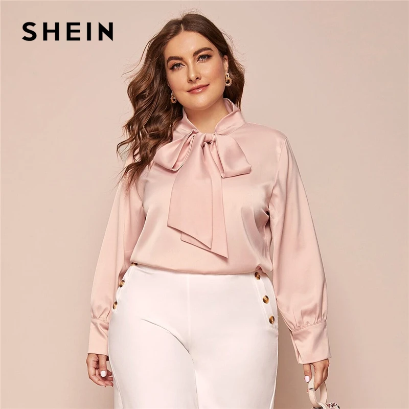 Шеин размера плюс, розовый галстук-бабочка, воротник, одноцветная блузка, Топ для женщин, осень, с рукавом Бишоп, весна, элегантная Офисная Леди, плюс блузки