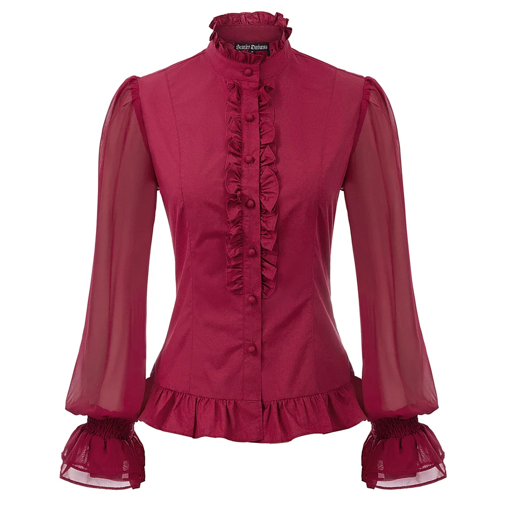 Винтажная блузка женские топы весна Стимпанк Викторианский стиль длинный рукав стоячий воротник с рюшами украшенная рубашка в готическом ...