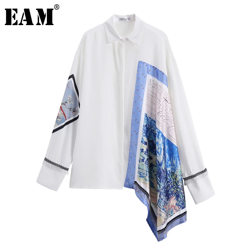 [EAM] 2019 новый сезон: Весна-Лето нагрудные с длинным рукавом белый Нерегулярные принтом большой размеры женская рубашка, блузка Мода прилив ...