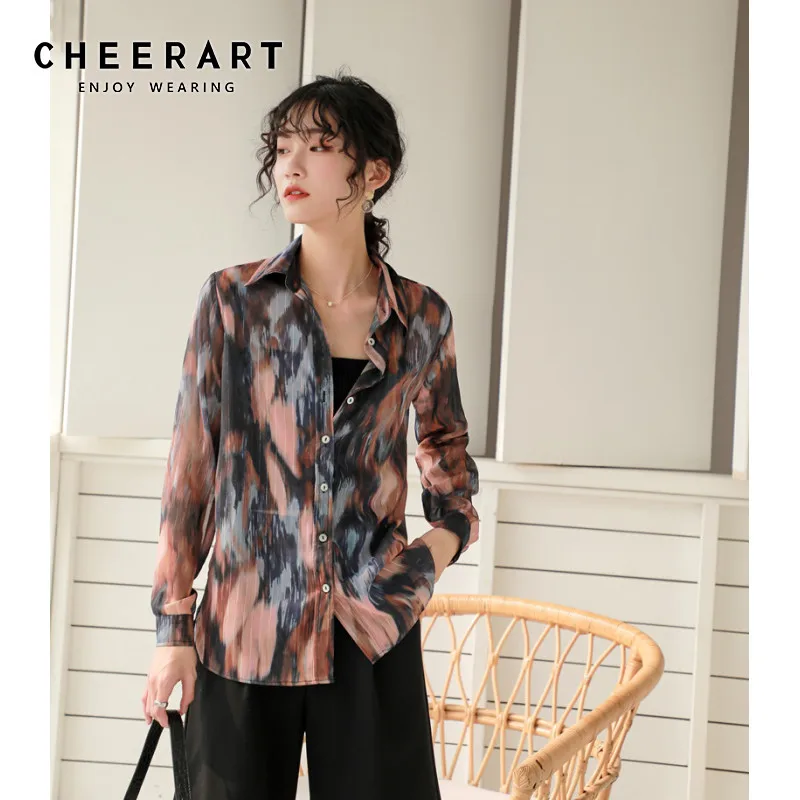 CHEERART металлическая цветная прозрачная блузка с галстуком и длинным рукавом на пуговицах Женская Прозрачная женская рубашка с воротником 2020