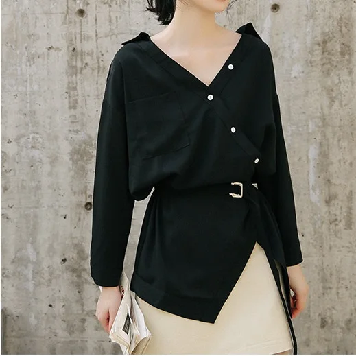 Блузка женская, с треугольным вырезом, длинным рукавом и ассиметричной полоской, на осень и зиму, 2019