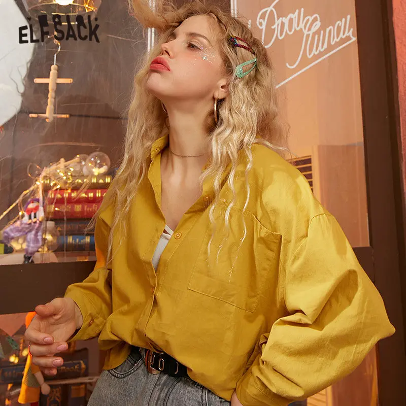 ELFSACK, разноцветная однотонная женская рубашка оверсайз в минималистическом стиле, весна 2020, простые женские повседневные топы с заниженным плечом и рукавом в Корейском стиле