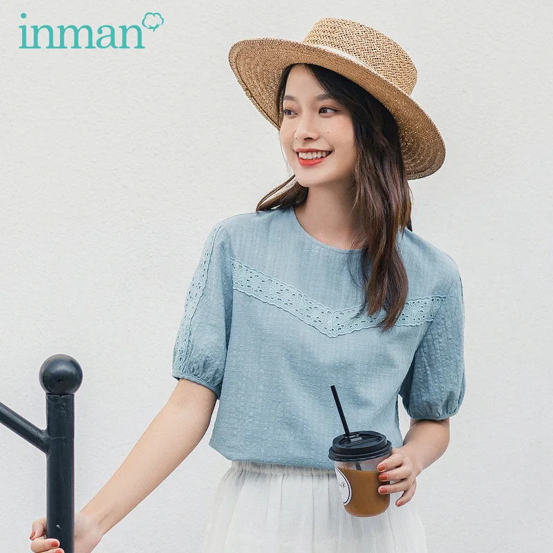 INMAN 2020 Лето Новое прибытие литературный круглый воротник кружева сплайсинга Досуг Свободный жаккард ткань блузка