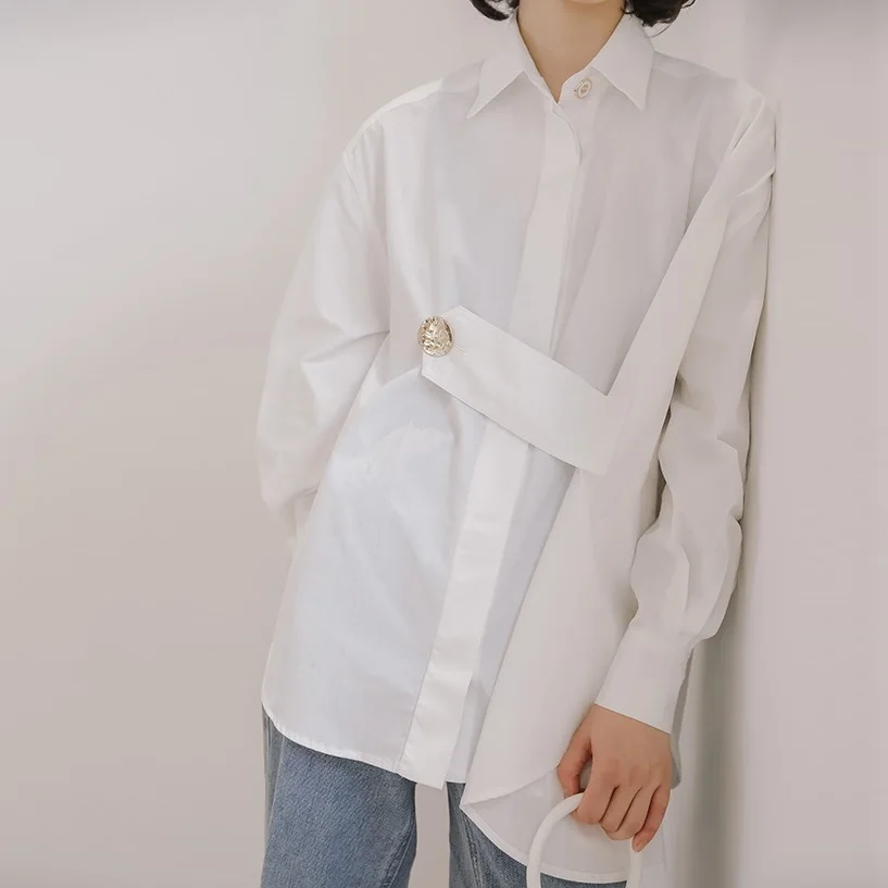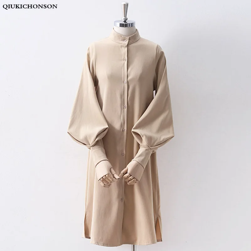 Женская блузка с длинным рукавом-фонариком в Корейском стиле, весенне-осенняя однобортная длинная рубашка белого цвета с разрезом и воротником-стойкой