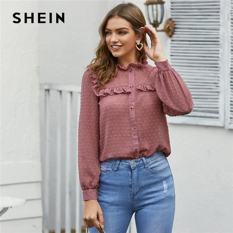 SHEIN розовая швейцарская блузка в горошек с оборкой, Женская Весенняя блузка с длинным рукавом и стоячим воротником, офисные женские элегант...