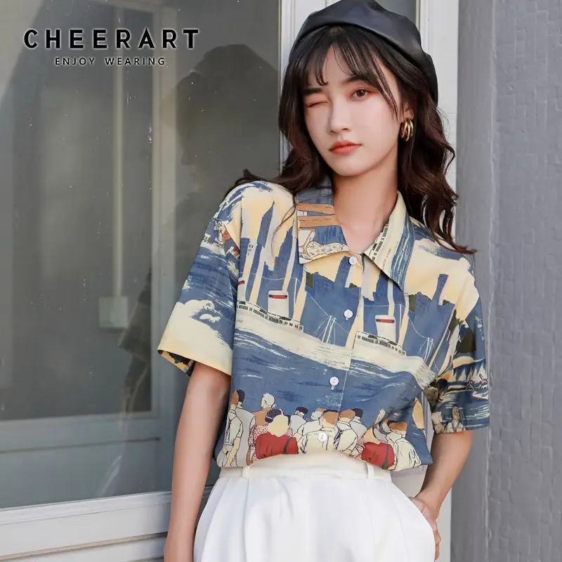 Женская блузка с коротким рукавом CHEERART, винтажная блузка с принтом на пуговицах и воротником на лето 2020