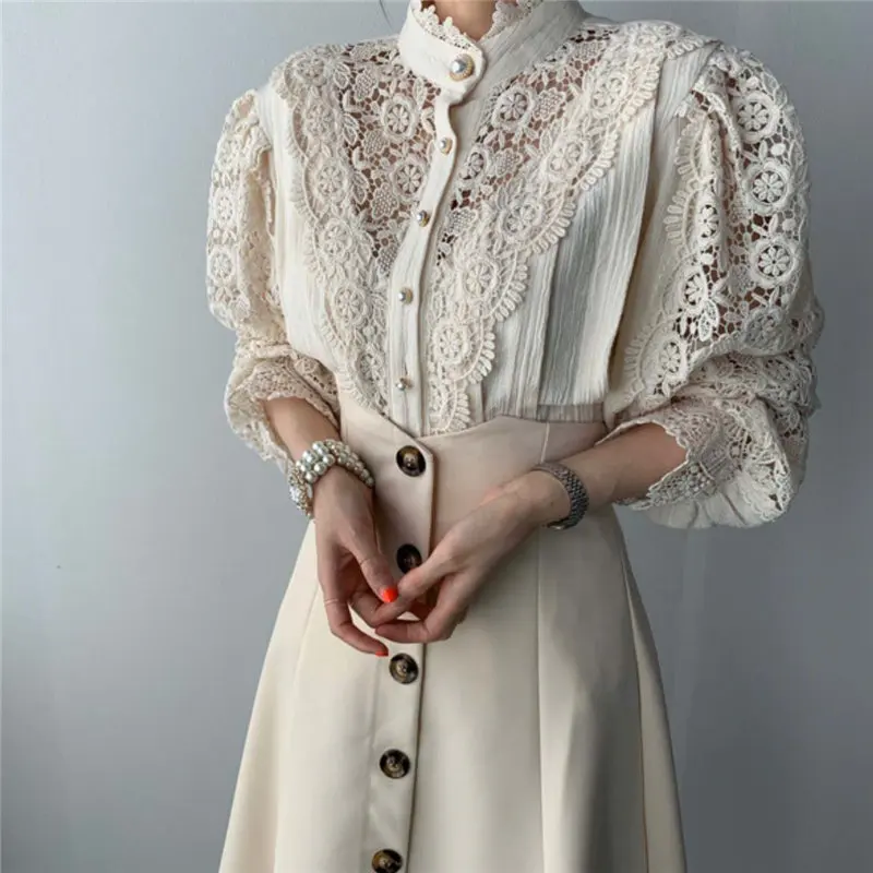 Однотонные кружевные рубашки на пуговицах для женщин 2020 Весенняя Элегантная туника с v-образным вырезом и длинным рукавом Топы 4XL 5XL свободн...
