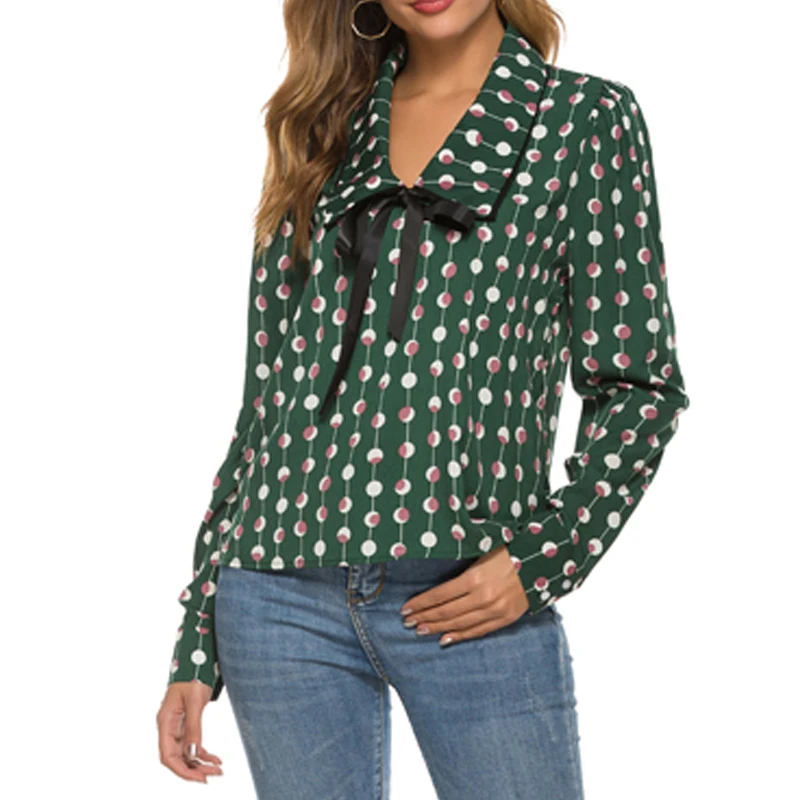 Шифоновая блуза в горошек с длинным рукавом для женщин 2020 Весенняя Офисная женская зеленая Ретро рабочая одежда рубашка размера плюс S Топы XL